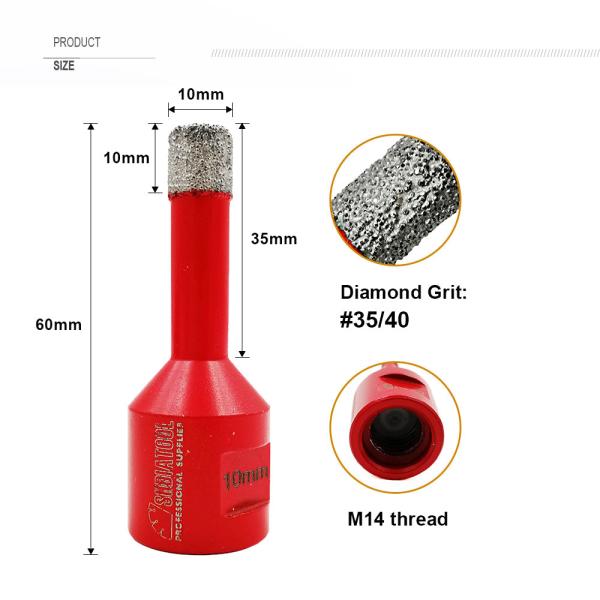 Quantity: 3pcs/set Specificiation: Diameter 6mm, 8mm, 10mm, M14 connection, Total height 60MM, Diamond height 10MM Application: Dry/wet drilling for porcelain tile, granite, marble, ceramic Feature...