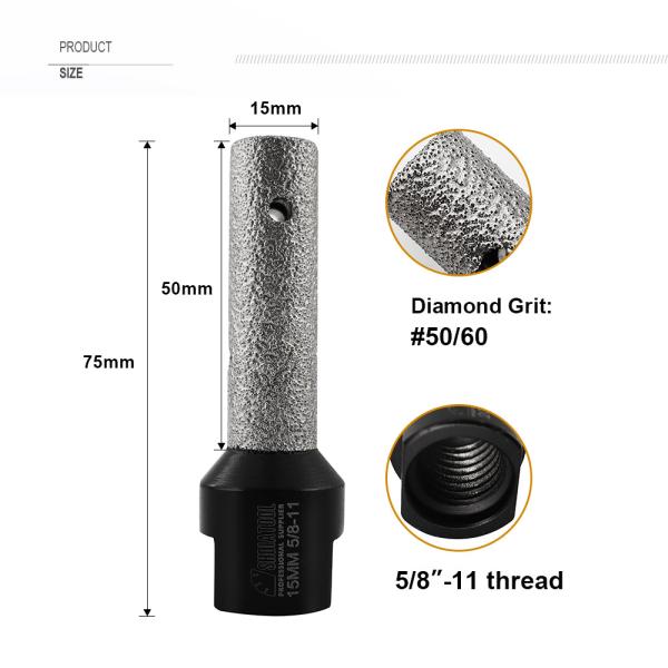 Item: Vacuum Brazed Diamond finger bits Milling bits for tile, stone, countertopQuantity: 1pc,2pcsSpecification:  15MM  Diameter, 50MM workable length, 5/8-11 thread, Grit #50/60 Total Length: 75mm, ...