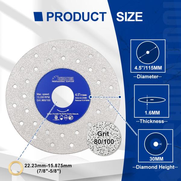 Diameter: 115mm(4.5inch), Bore: 22.23mm, with a 15.875mm washer; Segment height: 30mm, Segment thickness: 1.6mm;