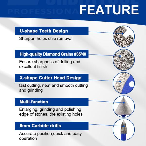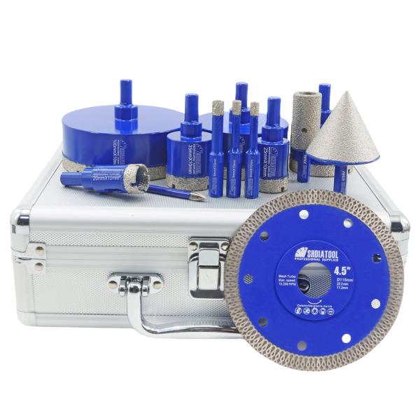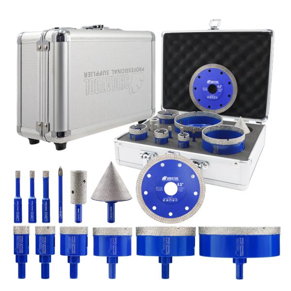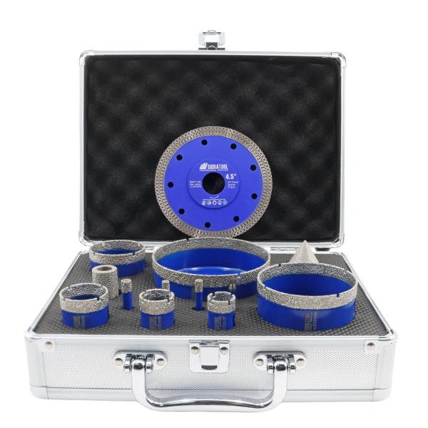 Item: YAKTOOLS 12pcs Drilling Bit Kit Triangle Shank Carbide Bit 115mm X Mesh Cutting Disc  Milling Bit Chamfer Hex for Granite Marble Porcelain  Quantity: 12pcs/box(6/6/8/20/25/35/50/75/100mm Diamo...