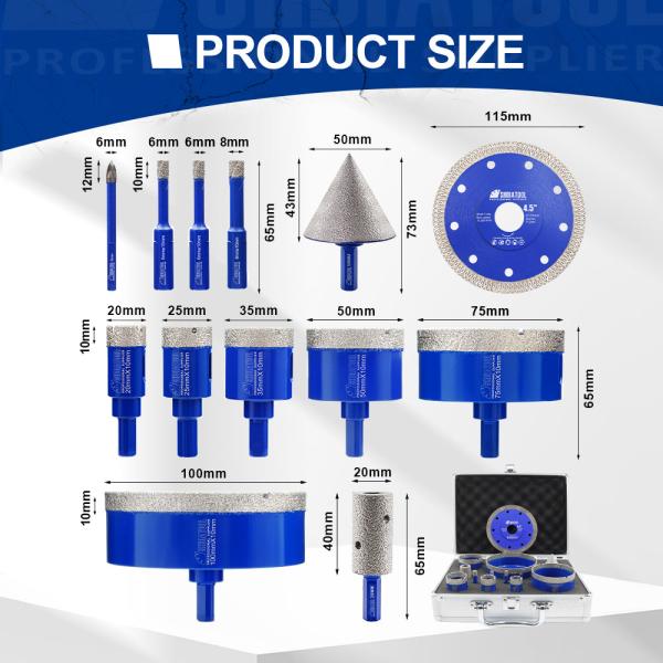 Quantity: 12pcs/box(6/6/8/20/25/35/50/75/100mm Diamond Core Drill Bits