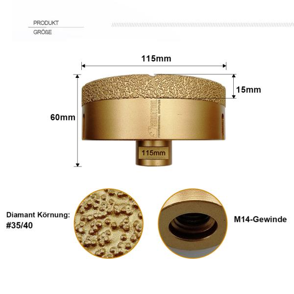 Available diameter: 115mm Specification: M14 connection, Total height 60MM, Diamond height 15MM Color: Golden Applicat...