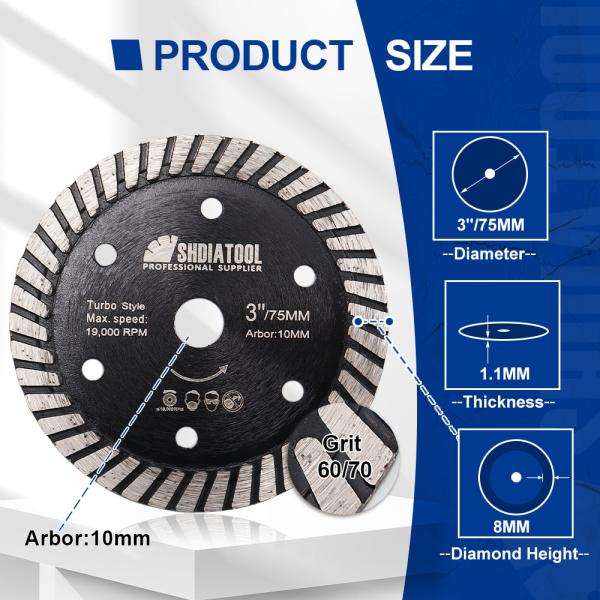 Item: 3" (75MM) Diamond Hot Pressed Ceramic Turbo Blade Quantity: 2pcs,10pcsSpecification: Diameter 75mm/3", bore 10mm, thickness of diamond 1.1mm,diamond height 8mmApplication:  For ceremic tile, har...