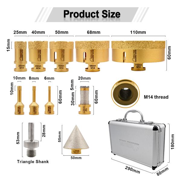 Item: YAKTOOLS Diamond Drill Bits Kit Quantity: 11pcs,with aluminium box Connection: M14 Thread Specificiation: