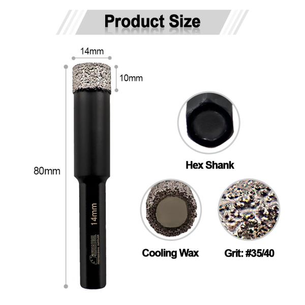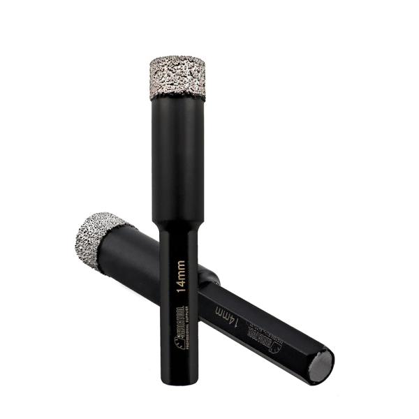 Item:Vaccum Brazed Diamond drilling bits, Dry drilling for stone, masonry, ceramic/tile.... Quantity: 2pcs ,5pcs Specification: Diameter14 mm, Hexagon Shank, diamond length 10mm Application: For drill...