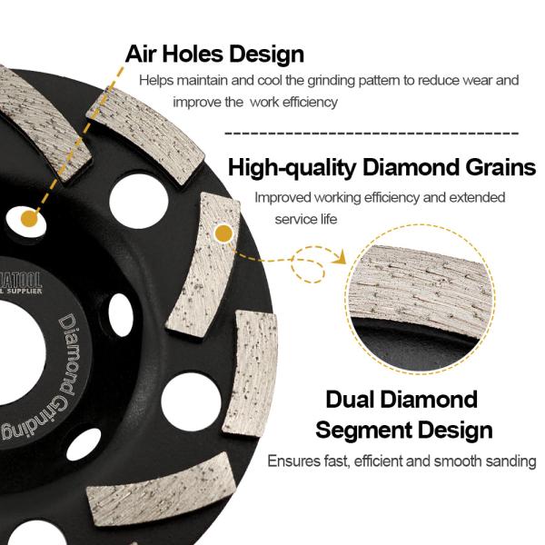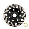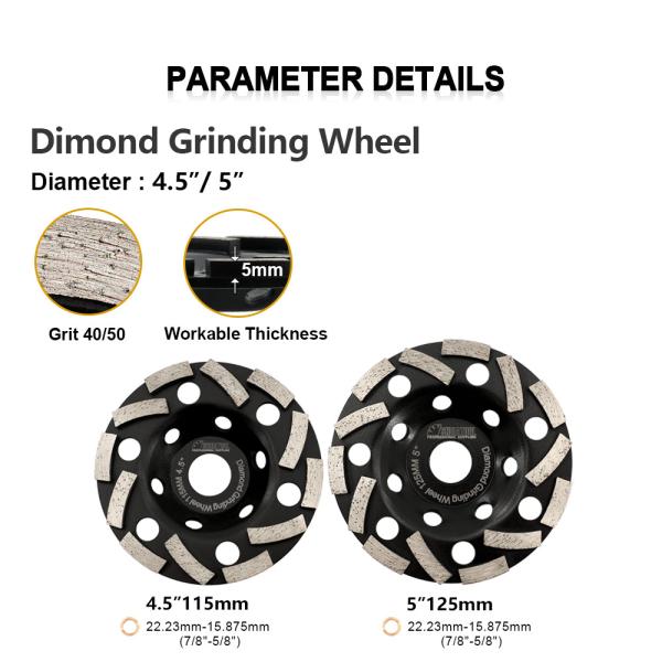 Item: Diamond Grinding Cup Wheel Specification: Diameter 4.5"/115mm, 5"/125mm; Bore 22.23mm, with a washer(15.875mm); Workable Thickness 5mm; Grit #40/50 Application:For Grinding Concrete, Masonry M...