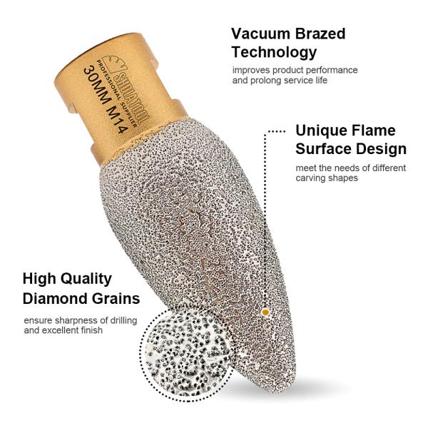 Item: Diamond Engraved Milling Bits  Vacuum Brazed Hole Saw Quantity: 1pc Connection: M14 Thread Specification: Diameter 30mm,Total length 82mm;Workable Length 60mm;Grit#45/50 Application: Used for...