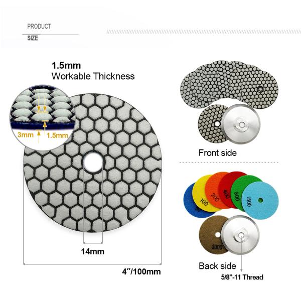 Quantity:  #50, #100, #200, #400,#3000 Each grit 7pcs Specification: Diameter 100mm/4inch", thickness 1.5mm Application: For granite & marble polishing Feature:     1. Flexible, suitable for di...