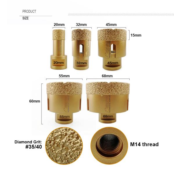 Available diameter: 20mm,32mm,45mm,55mm,68mm Specification: M14 connection, Total height 60MM, Diamond height 15MM Color: Golden Application:  Dry/wet drilling for porcelain tile, granite, marble, s...