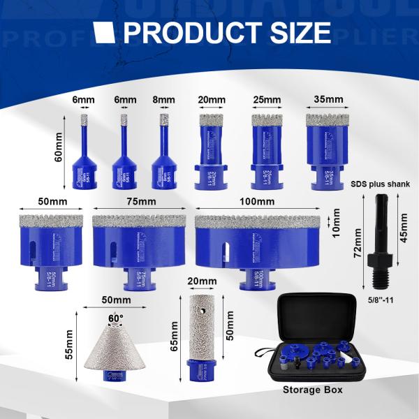 9 pcs Drill Bits: 6/6/8/20/25/35/50/75/100mm; Diamond Height: 10mm; Total Length: 60mm;
