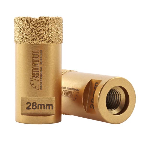 Available diameter: 28mm Specification: M14 connection, Total height 60MM, Diamond height 15MM Color: Golden Application:  Dry/wet drilling for porcelain tile, granite, marble, stone, Masonry, brick...