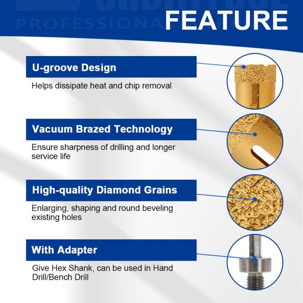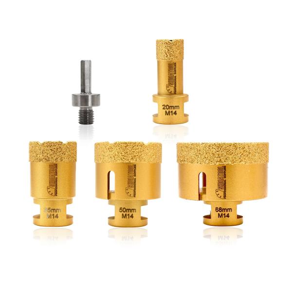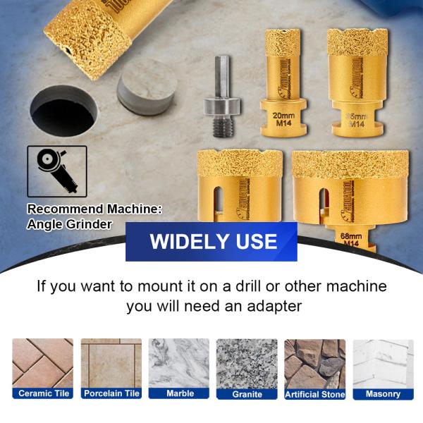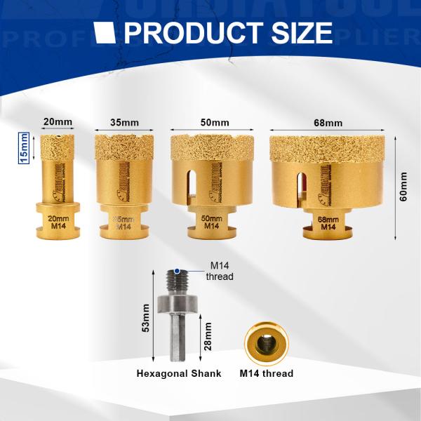 Item:  YAKTOOLS 5pcs 20/35/50/68MM Drill Bits Hex Adapter M14  Drill Bits Kit for Tile Marble Granite Porcelain Sandstone Specification:   Drill Bits: 20/35/50/68MM Diameter, 15mm Diamond Height, 60m...