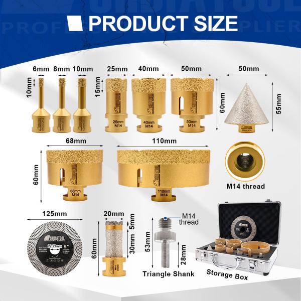Item: YAKTOOLS Diamond Core Drill Bits12pcs/Kit Ceramic Tile Hole Saw SetQuantity: 12pcs,with Aluminum BoxConnection: M...