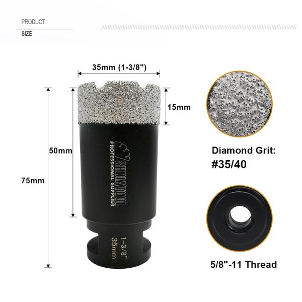 Size: 35mm,1-3/8 inchs; Total length: 75MM; Diamond height 15mm; The max workable depth: 50mm.
