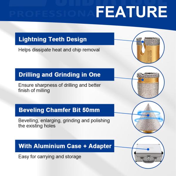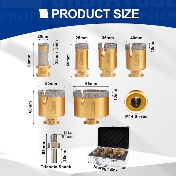 Item: YAKTOOLS Diamond Drill Bits Kit Quantity: 7pcs with aluminium box Connection: M14 Thread Specificiation:
