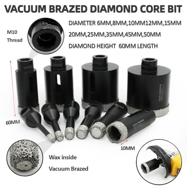 Specifications: M10 Connection. Total Height 60MM, Diamond Height 10MMDiameter 6mm, 8mm, 10mm, 12mm, 15mm, 20mm, 25mm, 35mm, 45mm, 50mmColor: Black. Machine: Suitable for angle grinder M10 or one adap...