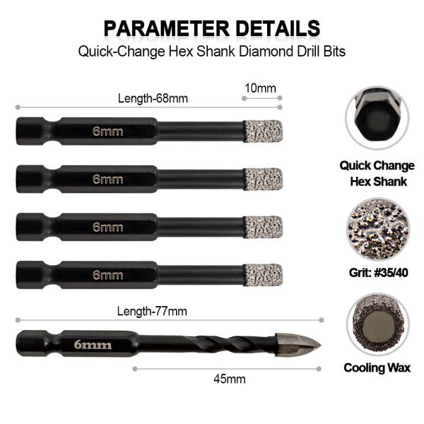 Item: Dia 6MM Vaccum Brazed Diamond drilling bits, Dry drilling for stone, masonry, ceramic/tile.... Quantity: 5pcs(4p...